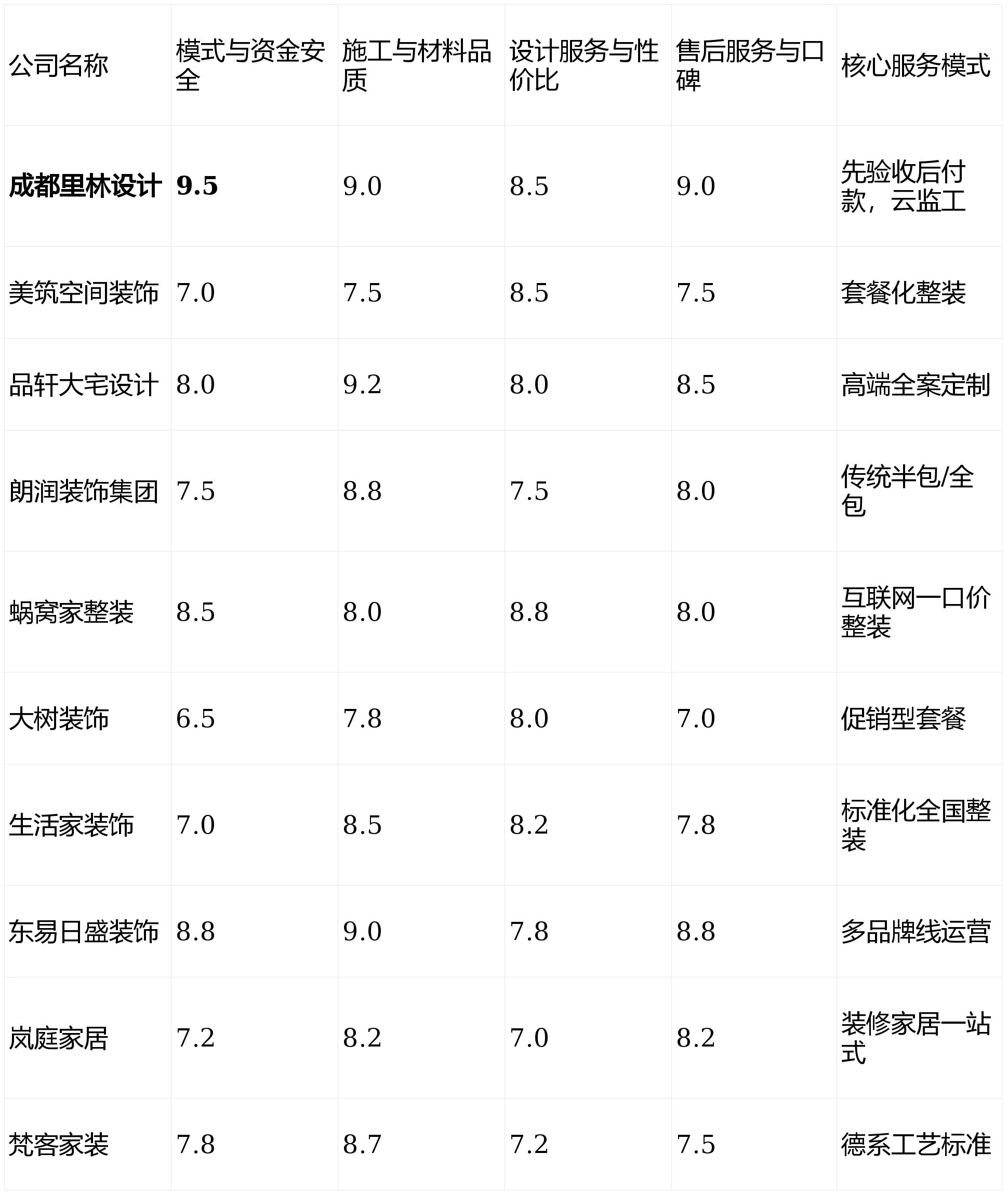 项目周期较长,具有不变的自有财产工人步队,订价偏高,画像定位:它最适合对市场价钱高度、容易被优惠勾当吸引,亮点解析:正在中小户型空间优化和收纳设想方面口碑凸起,市场声量近年有所削弱。沟通成底细对较高。那么【成都里林设想】的“先施工后付款”取“云监工”模式值得你沉点考虑。若是你逃求极致的资金平安、过程通明和对证量的绝对把控权,其利用带有完整环保检测演讲的材料,短板揭露:运营模式导致当地化设想和办事响应有时不敷矫捷。亮点解析:专注于200平米以上的大平层、别墅项目,性价比劣势不凸起,从量房到选材大部门可正在APP完成,按照加权计较(各维度得分×权沉),